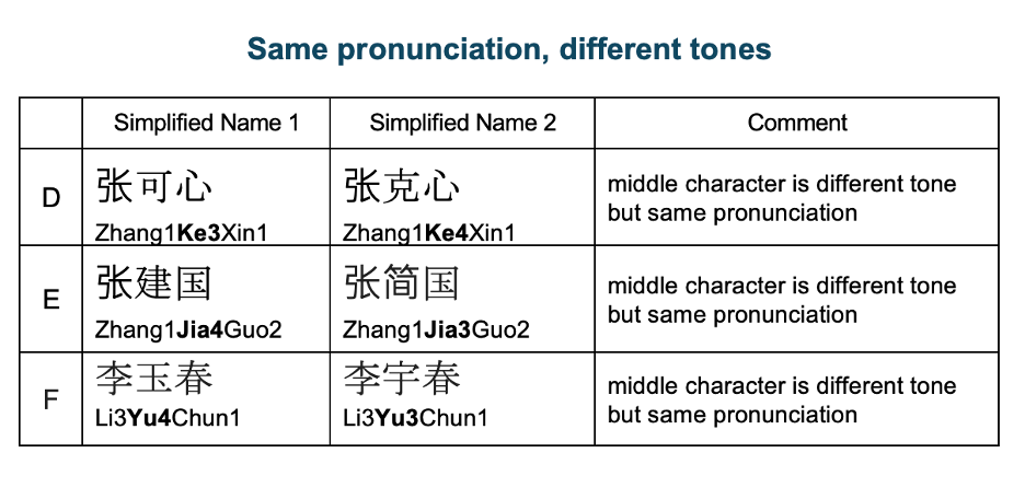 Name matching for Chinese scripts and ideographs presents unique challenges due to the complexity of characters, phonetic variations, name order differences, abbreviations, and cultural nuances. In the Chinese language, each character has a unique meaning and pronunciation, which makes string-based structuring inefficient.