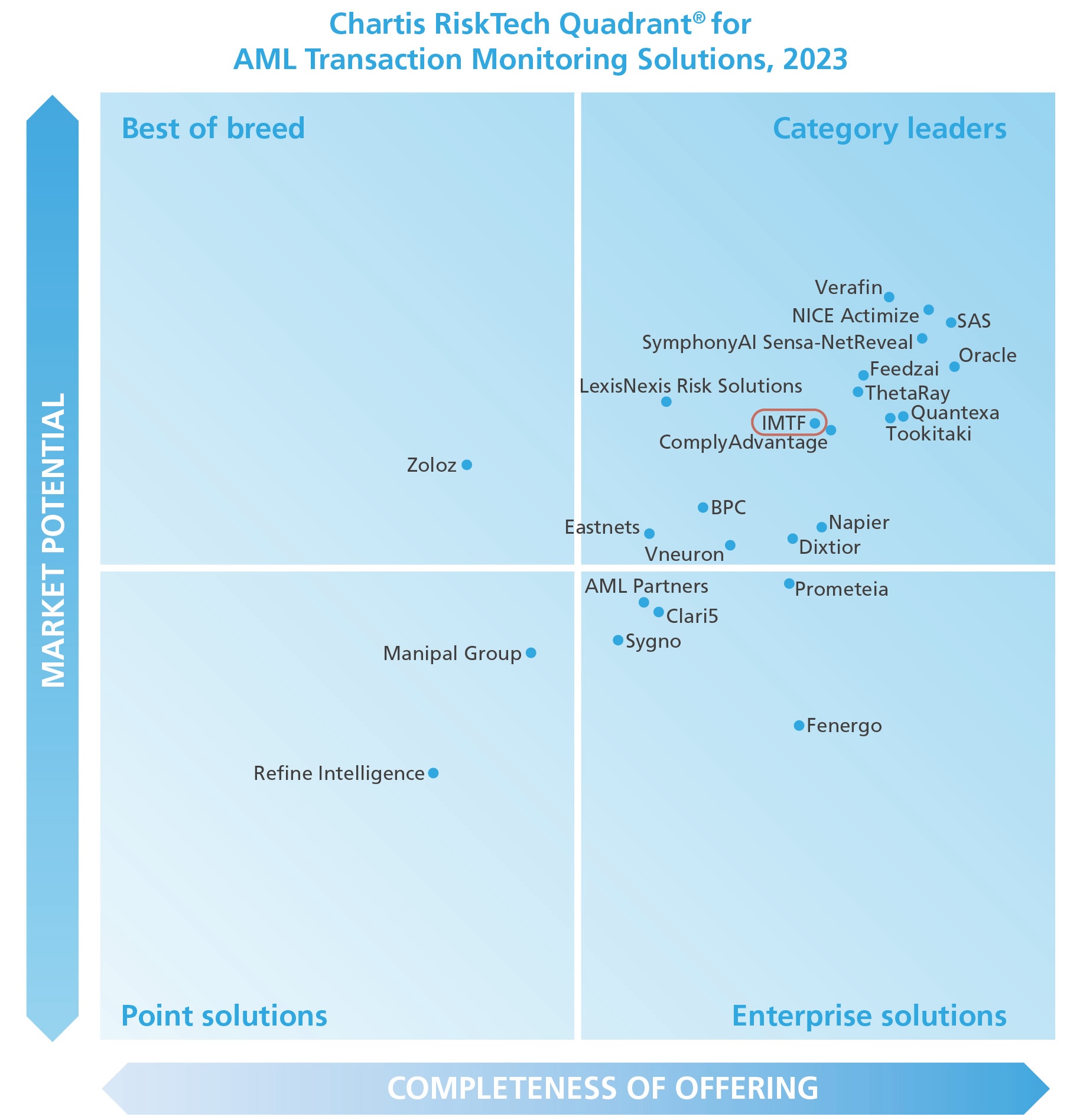 “IMTF’s category leader position reflects several factors—notably its typology mix, workflow, link analysis, and strength in analytical modeling. Moreover, behavioral models, deep learning, and conditional simulation across the solution contribute to efficiency and effectiveness at scale and speed, enabling flexibility and customization crucial in this space.”