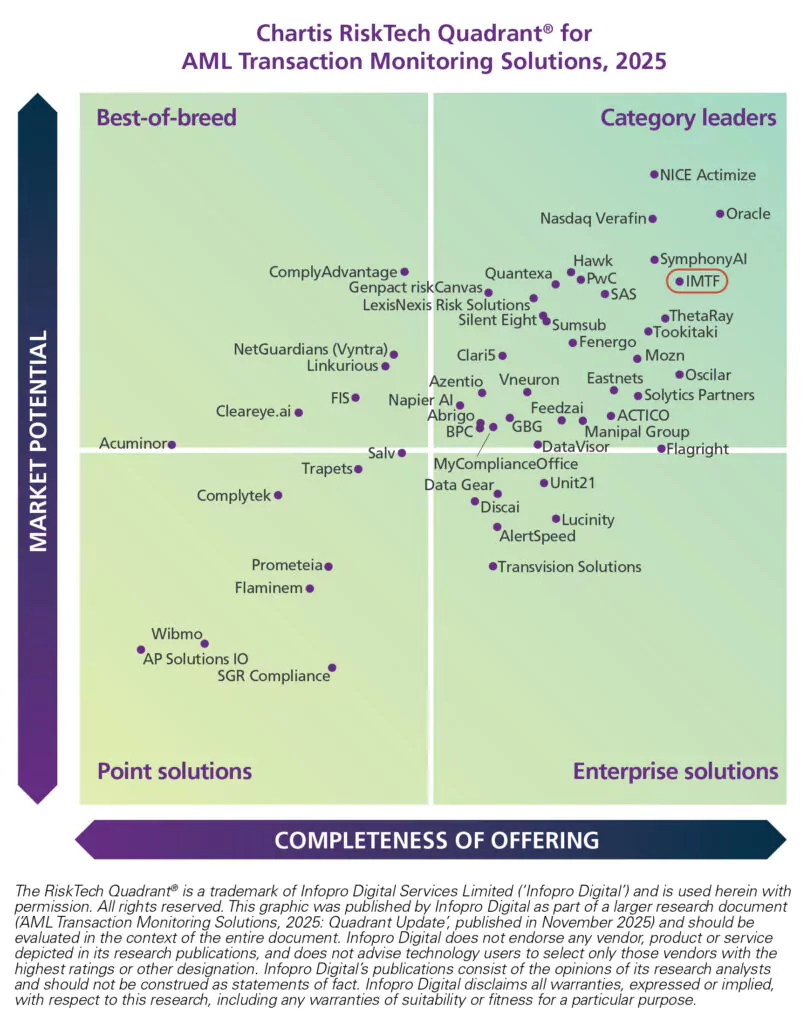 This distinction, published in the latest Chartis RiskTech Quadrant® for AML Transaction Monitoring Solutions, highlights IMTF’s continued innovation in financial crime compliance technology and reaffirms its position as one of the leading providers helping financial institutions detect and prevent money laundering with precision, efficiency, and intelligence.